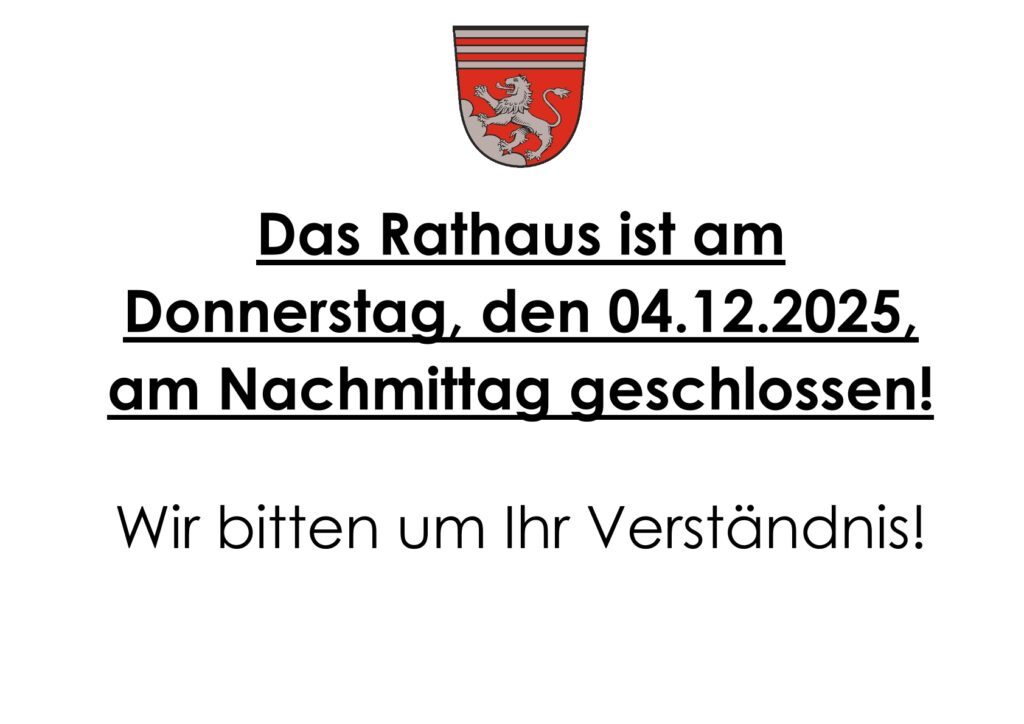 Das Rathaus ist am Donnerstag, den 04.12.2025, am Nachmittag geschlossen!